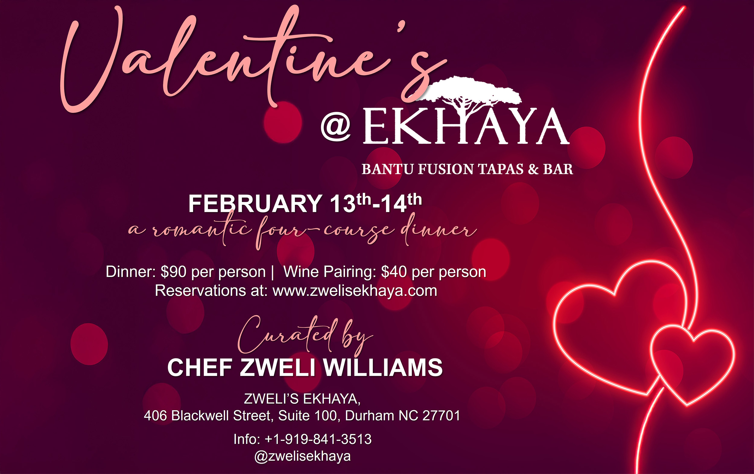 The award-winning Chef Zweli Williams introduces you to her culinary playground! Zweli's Ekhaya is the new elevated dining concept of our original concept Zweli's Kitchen (located at Brightleaf Square 905 W. Main St). Ekhaya is located in the heart of the American Tobacco Campus which sits in the heart of Downtown Durham. Ekhaya offers an eclectic array of flavors that caters to all five senses. The uniqueness of Ekhaya takes your palate on an excursion of fusions where Che Zweli is modernizing tribal dishes from nations throughout all of Africa. Welcome to Ekhaya, The Home!